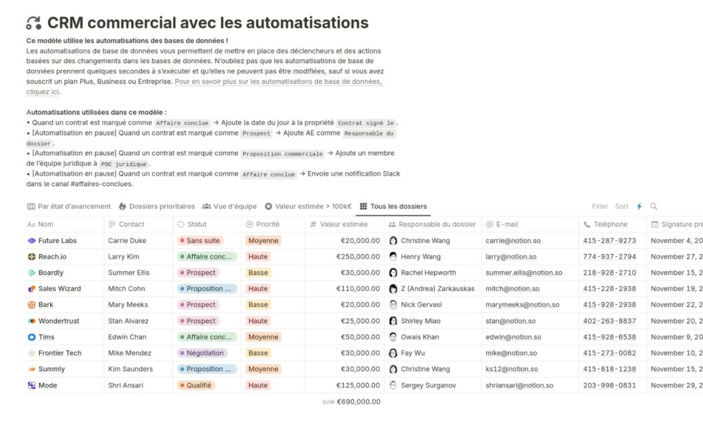 Notion propose des fonctionnalités d’automatisation intégrées :